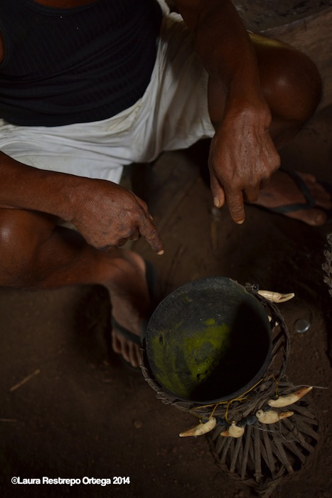 Edgar, our guide, advised we all have mambe when entering or leaving a sacred site. Mambe is a bright green powder made of toasted coca leaves and ash from the Yarumo tree (Cecropia peltata); the combination becomes a basic conductor to spiritual contemplation and learning—and in this case, a way to appease the gods for stepping on their sacred places.