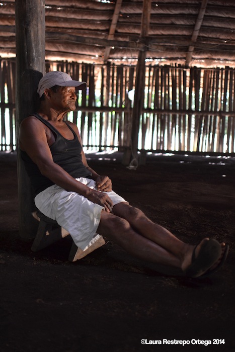We heard ancient stories passed down over generations through oral narrative. Jorge spoke of the birth of the Apaporis—once a great tree which was cut down and became the river as it sliced through the mountain. He was lively and energetic, switching between Spanish and his native tongue, sitting on his thinking bench, proudly displaying a generations-old necklace with eight jaguar teeth and a heavy wooden staff. At one point, Jorge broke down crying while clutching a wooden cross for his son who had recently passed away.