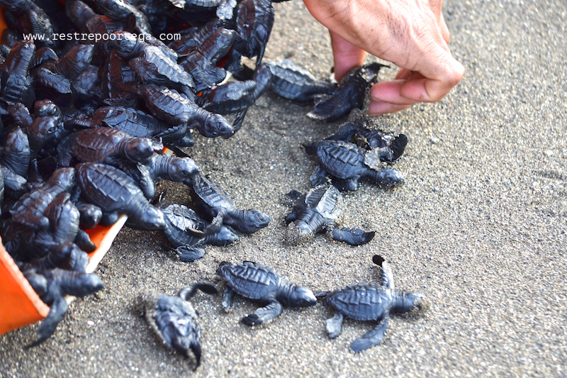También tuve la suerte de presenciar algo que siempre quise ver: La liberación de unas 80 crías de tortuga negra (Chelonia agassizii). Uno de los nativos, quien cuenta que antes cazaba estas mismas tortugas para vender y comer sus huevos, ahora se dedica a proteger los huevos y después liberar las tortuguitas al océano Pacífico cuando desovan, después de 60-90 días de incubación en la playa.